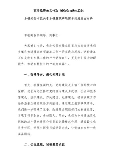 【七哥公文】2025年:乡镇党委书记关于乡镇履职事项清单交流发言材料+更多免费公文+VX:QiGeGongWen2024+更多免费公文+VX:QiGeGongWen2024