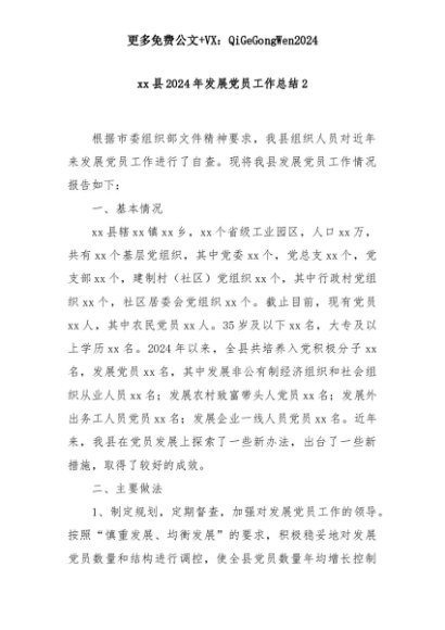 【七哥公文】2025年:xx县2024年发展党员工作总结2+更多免费公文+VX:QiGeGongWen2024+更多免费公文+VX:QiGeGongWen2024