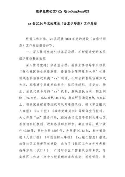 【七哥公文】2025年:xx县2024年党的建设(含意识形态)工作总结+更多免费公文+VX:QiGeGongWen2024+更多免费公文+VX:QiGeGongWen2024