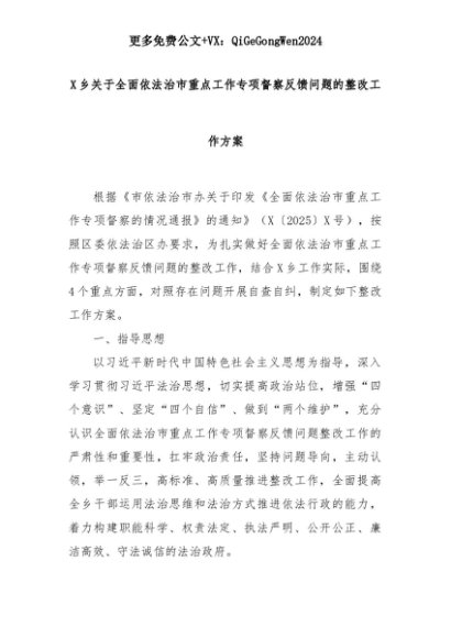 【七哥公文】2025年:X乡关于全面依法治市重点工作专项督察反馈问题的整改工作方案+更多免费公文+VX:QiGeGongWen2024+更多免费公文+VX:QiGeGongWen2024