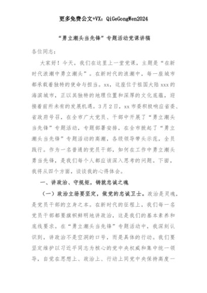 【七哥公文】2025年:“勇立潮头当先锋”专题活动党课讲稿+更多免费公文+VX:QiGeGongWen2024+更多免费公文+VX:QiGeGongWen2024
