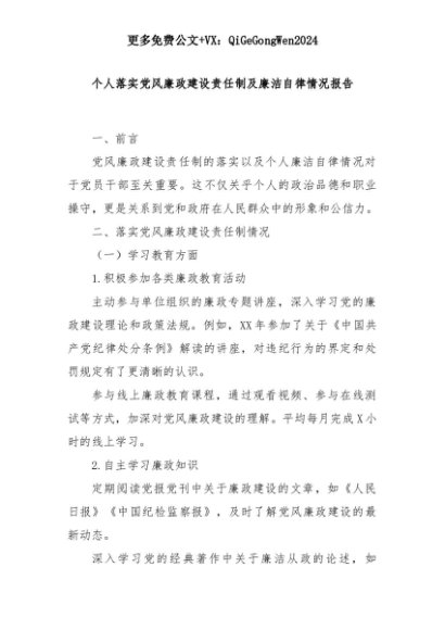 【七哥公文】2025年:个人落实党风廉政建设责任制及廉洁自律情况报告+更多免费公文+VX:QiGeGongWen2024+更多免费公文+VX:QiGeGongWen2024