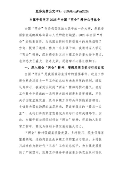 【七哥公文】2025年:乡镇干部学习2025年全国“两会”精神心得体会+更多免费公文+VX:QiGeGongWen2024+更多免费公文+VX:QiGeGongWen2024