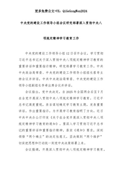 【七哥公文】2025年:中央党的建设工作领导小组会议研究部署深入贯彻中央八项规定精神学习教育工作+更多免费公文+VX:QiGeGongWen2024+更多免费公文+VX:QiGeGongWen2024