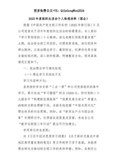 【七哥公文】2025年:2025年度组织生活会个人检视材料(国企)+更多免费公文+VX:QiGeGongWen2024+更多免费公文+VX:QiGeGongWen2024