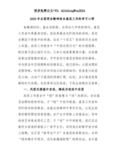 【七哥公文】2025年:2025年全国两会精神结合基层工作的学习心得+更多免费公文+VX:QiGeGongWen2024+更多免费公文+VX:QiGeGongWen2024