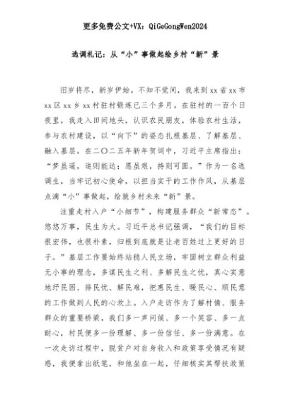 【七哥公文】2025年:选调札记:从“小”事做起绘乡村“新”景+更多免费公文+VX:QiGeGongWen2024+更多免费公文+VX:QiGeGongWen2024