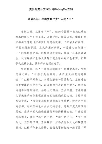 【七哥公文】2025年:选调札记:红梅赞歌“声”入我“心”+更多免费公文+VX:QiGeGongWen2024+更多免费公文+VX:QiGeGongWen2024