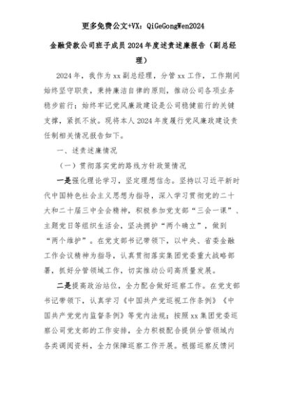 【七哥公文】2025年:金融贷款公司班子成员2024年度述责述廉报告(副总经理)+更多免费公文+VX:QiGeGongWen2024+更多免费公文+VX:QiGeGongWen2024