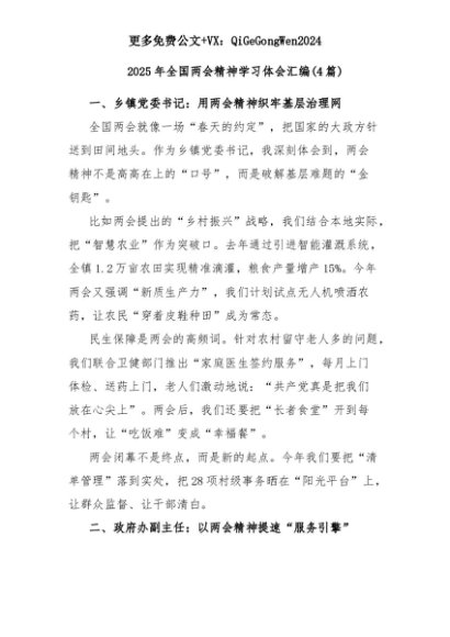 【七哥公文】2025年:(4篇)2025年全国两会精神学习体会汇编+更多免费公文+VX:QiGeGongWen2024+更多免费公文+VX:QiGeGongWen2024