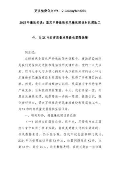 【七哥公文】2025年:2025年廉政党课:坚定不移推进党风廉政建设和反腐败工作,为XX市的高质量发展提供坚强保障+更多免费公文+VX:QiGeGongWen2024+更多免费公文+VX:QiGeGongWen2024