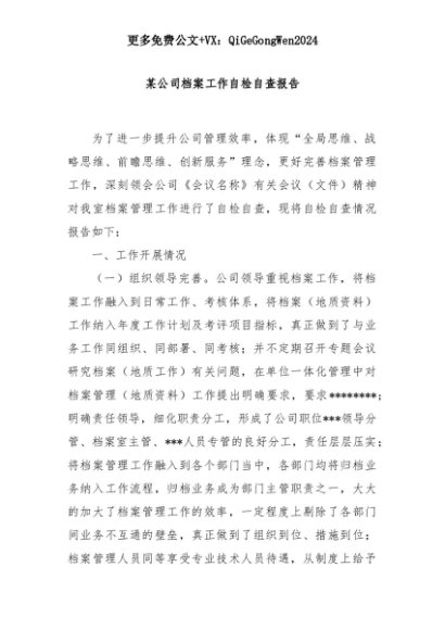 【七哥公文】2025年:某公司档案工作自检自查报告+更多免费公文+VX:QiGeGongWen2024+更多免费公文+VX:QiGeGongWen2024