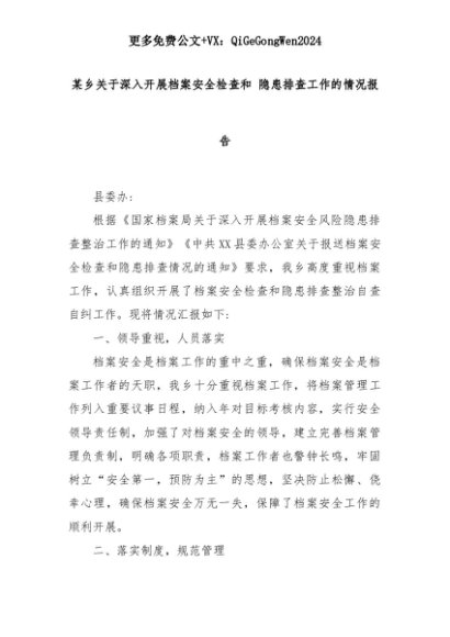 【七哥公文】2025年:某乡关于深入开展档案安全检查和 隐患排查工作的情况报告+更多免费公文+VX:QiGeGongWen2024+更多免费公文+VX:QiGeGongWen2024