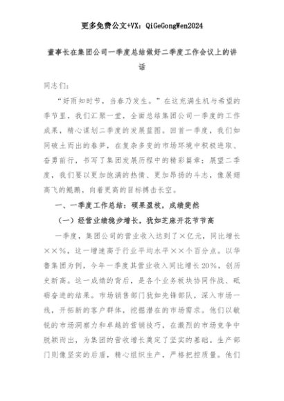 【七哥公文】2025年:董事长在集团公司一季度总结做好二季度工作会议上的讲话+更多免费公文+VX:QiGeGongWen2024+更多免费公文+VX:QiGeGongWen2024