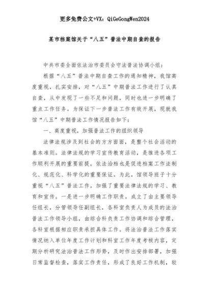 【七哥公文】2025年:某市档案馆关于“八五”普法中期自查的报告+更多免费公文+VX:QiGeGongWen2024+更多免费公文+VX:QiGeGongWen2024