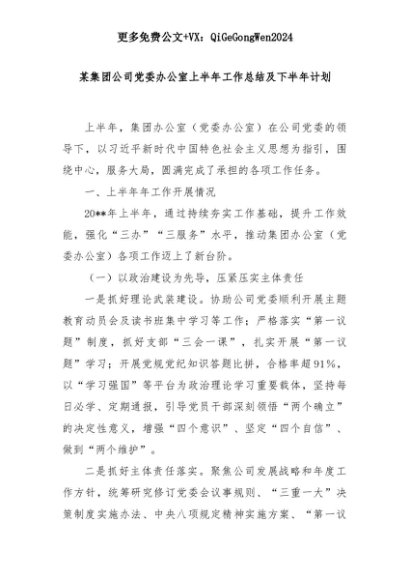 【七哥公文】2025年:某集团公司党委办公室上半年工作总结及下半年计划+更多免费公文+VX:QiGeGongWen2024+更多免费公文+VX:QiGeGongWen2024