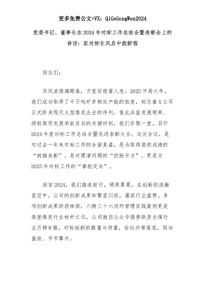 【七哥公文】2025年:党委书记、董事长在2024年对标工作总结会暨表彰会上的讲话:驭对标长风启中能新程+更多免费公文+VX:QiGeGongWen2024+更多免费公文+VX:QiGeGongWen2024