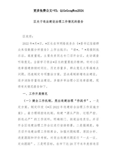 【七哥公文】2025年:区关于违法建设治理工作情况的报告+更多免费公文+VX:QiGeGongWen2024+更多免费公文+VX:QiGeGongWen2024
