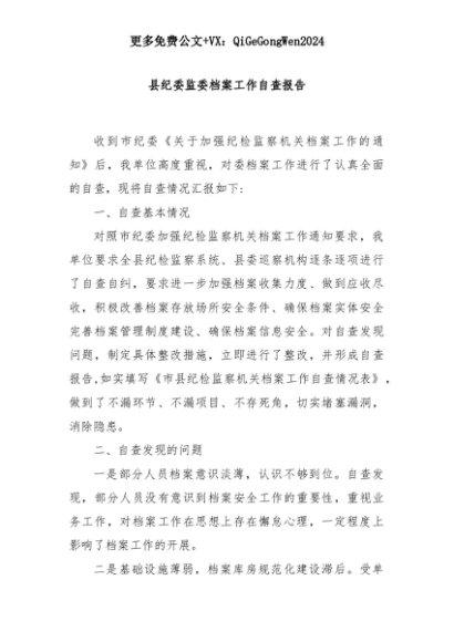 【七哥公文】2025年:县纪委监委档案工作自查报告+更多免费公文+VX:QiGeGongWen2024+更多免费公文+VX:QiGeGongWen2024