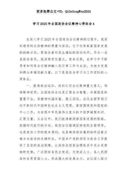 【七哥公文】2025年:学习2025年全国政协会议精神心得体会4+更多免费公文+VX:QiGeGongWen2024+更多免费公文+VX:QiGeGongWen2024