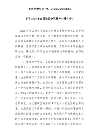 【七哥公文】2025年:学习2025年全国政协会议精神心得体会3+更多免费公文+VX:QiGeGongWen2024+更多免费公文+VX:QiGeGongWen2024