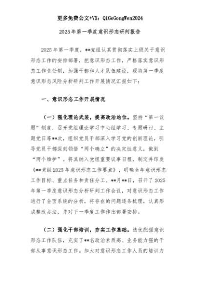 【七哥公文】2025年:2025年第一季度意识形态研判报告+更多免费公文+VX:QiGeGongWen2024+更多免费公文+VX:QiGeGongWen2024