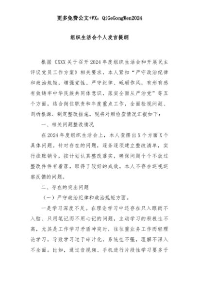 【七哥公文】2025年:组织生活会个人发言提纲+更多免费公文+VX:QiGeGongWen2024+更多免费公文+VX:QiGeGongWen2024