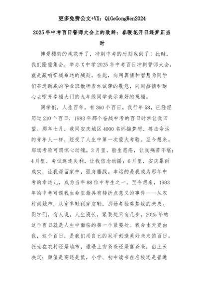 【七哥公文】2025年:2025年中考百日誓师大会上的致辞:春暖花开日逐梦正当时+更多免费公文+VX:QiGeGongWen2024+更多免费公文+VX:QiGeGongWen2024