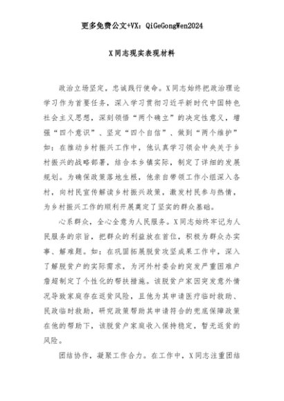 【七哥公文】2025年:X同志现实表现材料+更多免费公文+VX:QiGeGongWen2024+更多免费公文+VX:QiGeGongWen2024