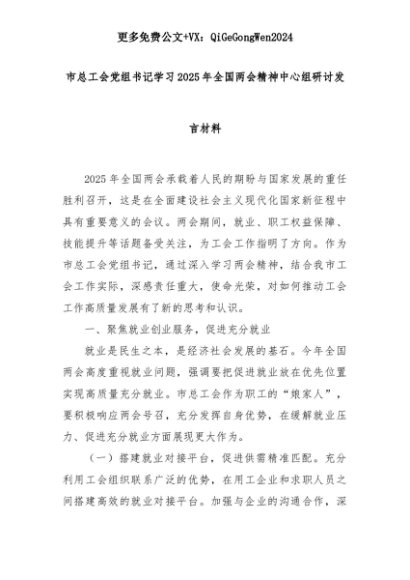 【七哥公文】2025年:市总工会党组书记学习2025年全国两会精神中心组研讨发言材料+更多免费公文+VX:QiGeGongWen2024+更多免费公文+VX:QiGeGongWen2024