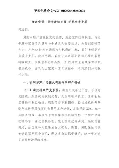 【七哥公文】2025年:廉政党课:坚守廉洁底线 护航全市发展+更多免费公文+VX:QiGeGongWen2024+更多免费公文+VX:QiGeGongWen2024
