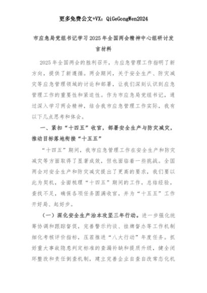 【七哥公文】2025年:市应急局党组书记学习2025年全国两会精神中心组研讨发言材料+更多免费公文+VX:QiGeGongWen2024+更多免费公文+VX:QiGeGongWen2024