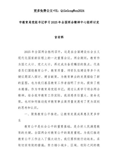 【七哥公文】2025年:市教育局党组书记学习2025年全国两会精神中心组研讨发言材料+更多免费公文+VX:QiGeGongWen2024+更多免费公文+VX:QiGeGongWen2024