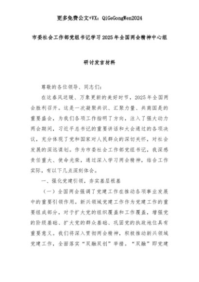 【七哥公文】2025年:市委社会工作部党组书记学习2025年全国两会精神中心组研讨发言材料+更多免费公文+VX:QiGeGongWen2024+更多免费公文+VX:QiGeGongWen2024