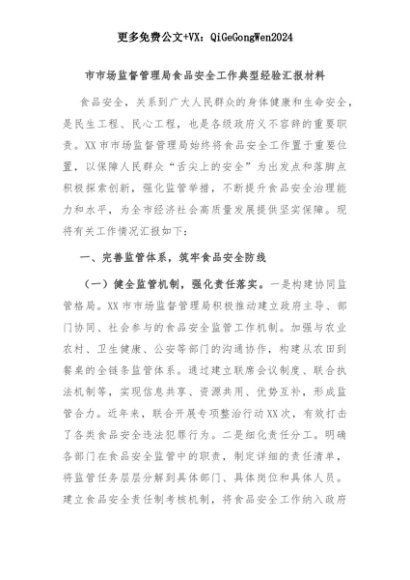 【七哥公文】2025年:市市场监督管理局食品安全工作典型经验汇报材料+更多免费公文+VX:QiGeGongWen2024+更多免费公文+VX:QiGeGongWen2024