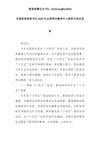 【七哥公文】2025年:市国资委党委书记2025年全国两会精神中心组研讨发言材料+更多免费公文+VX:QiGeGongWen2024+更多免费公文+VX:QiGeGongWen2024