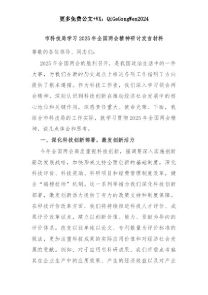 【七哥公文】2025年:市科技局学习2025年全国两会精神研讨发言材料+更多免费公文+VX:QiGeGongWen2024+更多免费公文+VX:QiGeGongWen2024