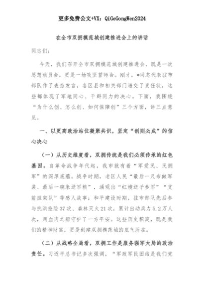 【七哥公文】2025年:在全市双拥模范城创建推进会上的讲话+更多免费公文+VX:QiGeGongWen2024+更多免费公文+VX:QiGeGongWen2024