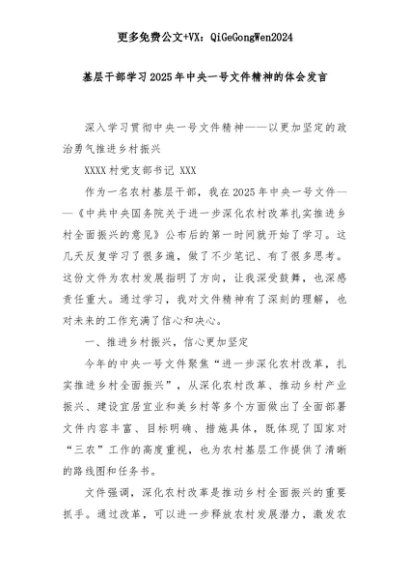 【七哥公文】2025年:基层干部学习2025年中央一号文件精神的体会发言+更多免费公文+VX:QiGeGongWen2024+更多免费公文+VX:QiGeGongWen2024