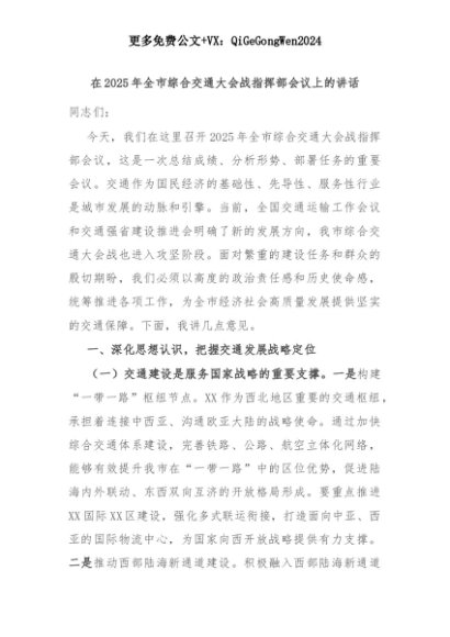 【七哥公文】2025年:在2025年全市综合交通大会战指挥部会议上的讲话+更多免费公文+VX:QiGeGongWen2024+更多免费公文+VX:QiGeGongWen2024