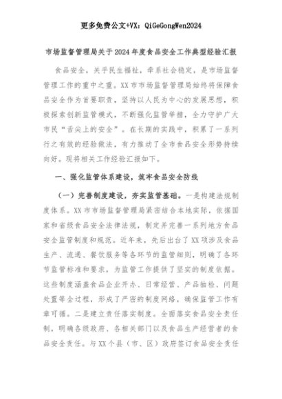 【七哥公文】2025年:市场监督管理局关于2024年度食品安全工作典型经验汇报+更多免费公文+VX:QiGeGongWen2024+更多免费公文+VX:QiGeGongWen2024