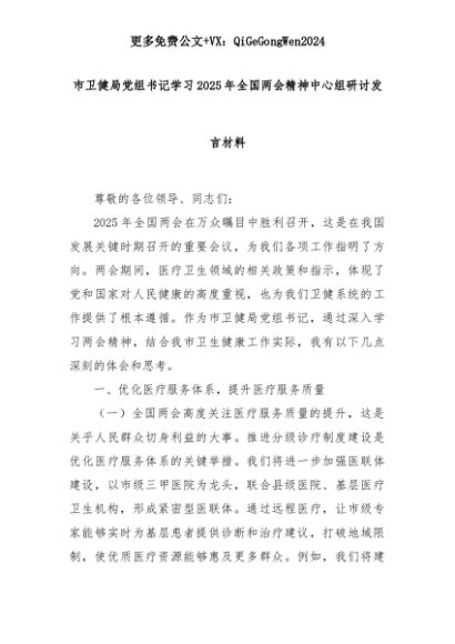 【七哥公文】2025年:市卫健局党组书记学习2025年全国两会精神中心组研讨发言材料+更多免费公文+VX:QiGeGongWen2024+更多免费公文+VX:QiGeGongWen2024