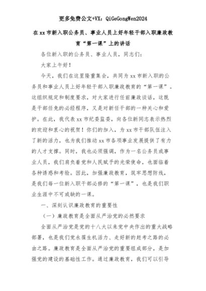 【七哥公文】2025年:在xx市新入职公务员、事业人员上好年轻干部入职廉政教育“第一课”上的讲话+更多免费公文+VX:QiGeGongWen2024+更多免费公文+VX:QiGeGongWen2024