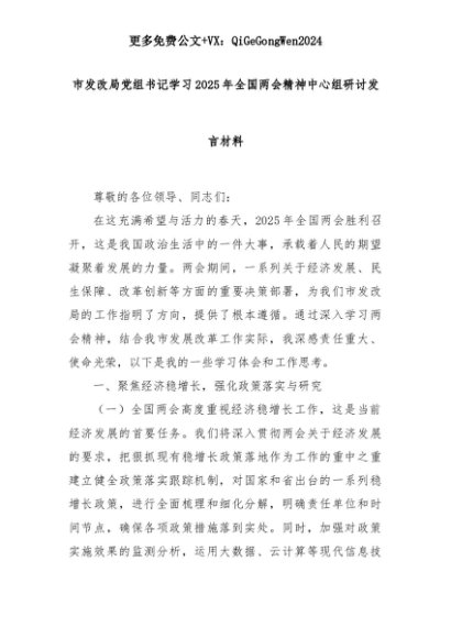 【七哥公文】2025年:市发改局党组书记学习2025年全国两会精神中心组研讨发言材料+更多免费公文+VX:QiGeGongWen2024+更多免费公文+VX:QiGeGongWen2024