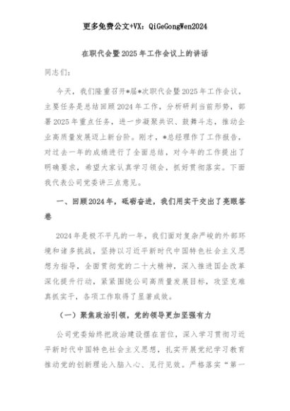 【七哥公文】2025年:在职代会暨2025年工作会议上的讲话+更多免费公文+VX:QiGeGongWen2024+更多免费公文+VX:QiGeGongWen2024