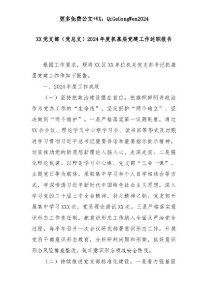 【七哥公文】2025年:XX党支部(党总支)2024年度抓基层党建工作述职报告+更多免费公文+VX:QiGeGongWen2024+更多免费公文+VX:QiGeGongWen2024
