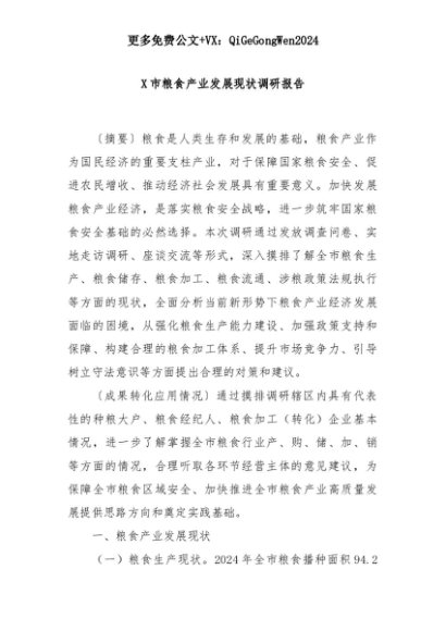 【七哥公文】2025年:X市粮食产业发展现状调研报告+更多免费公文+VX:QiGeGongWen2024+更多免费公文+VX:QiGeGongWen2024