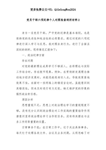 【七哥公文】2025年:党员干部六项纪律个人对照检查剖析材料2+更多免费公文+VX:QiGeGongWen2024+更多免费公文+VX:QiGeGongWen2024