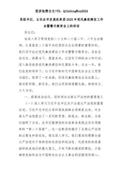 【七哥公文】2025年:党组书记、主任在市发展改革委2025年党风廉政建设工作会暨警示教育会上的讲话+更多免费公文+VX:QiGeGongWen2024+更多免费公文+VX:QiGeGongWen2024