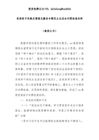 【七哥公文】2025年:党委班子巡察反馈意见整改专题民主生活会对照检查材料(集团公司)+更多免费公文+VX:QiGeGongWen2024+更多免费公文+VX:QiGeGongWen2024
